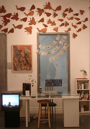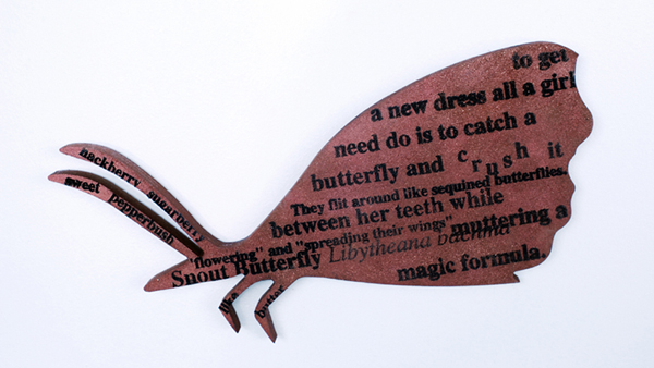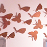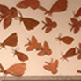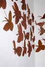 Mariposa Machismo is a project involving the butterfly phenomena that occurred in South Texas in the summer and fall of 2006 and is still ongoing to a lesser extent. A multitude of brown snout-nosed butterflies was generated by the unusual climate circumstances of extreme drought followed by torrential rains. Global warming was most likely a contributing factor. Curiously, 95% of them were male. The wall installation documents this unusual phenomena while examining the historical and current social implications of male butterfly bonding. Butterflies have also typically been associated with the ideals of femininity in the West. The butterflies are rendered on digitally cut MDF board, that has been rubbed with copper powder, and silkscreened using sand for a textural effect.