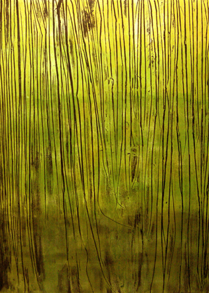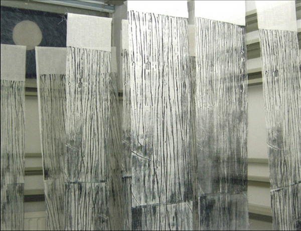 A Finnish girl stated that each winter, less and less snow falls in her country. They call this a “black winter” because without snow the landscape is very dark and gloomy. Another installation, Night Woods utilizes strips of sheer cloth printed using collagraphs made from plants near the lake or järvi. This work conveys the sense of a moonlit birch forest. I also editioned a collagraph called Summer's End using the same plate.